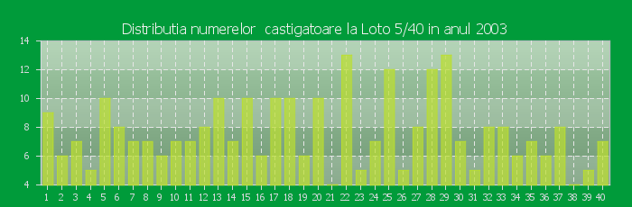 Arhiva rezultatelor Loto 5/40 pentru anul 2003 Filtrare dupa an: [ 1995 ][ 1996 ][ 1997 ][ 1998 ][ 1999 ][ 2000 ][ 2001 ][ 2002 ][ 2003 ][ 2004 ][ 2005 ][ 2006 ][ 2007 ][ 2008 ][ 2009 ][ 2010 ][ 2011 ][ 2012 ][ 2013 ][ 2014 ][ 2015 ][ 2016 ][ 2017 ][ 2018 ][ 2019 ][ 2020 ][ 2021 ][ 2022 ][ 2023 ][ 2024 ][ 2025 ] [ Cu câstigatori la categoria I ] [ Grafice câştigători Categoria I ] [ Grafice distribuţie numere câştigătoare ] [ Numere ne-extrase de mult timp ]